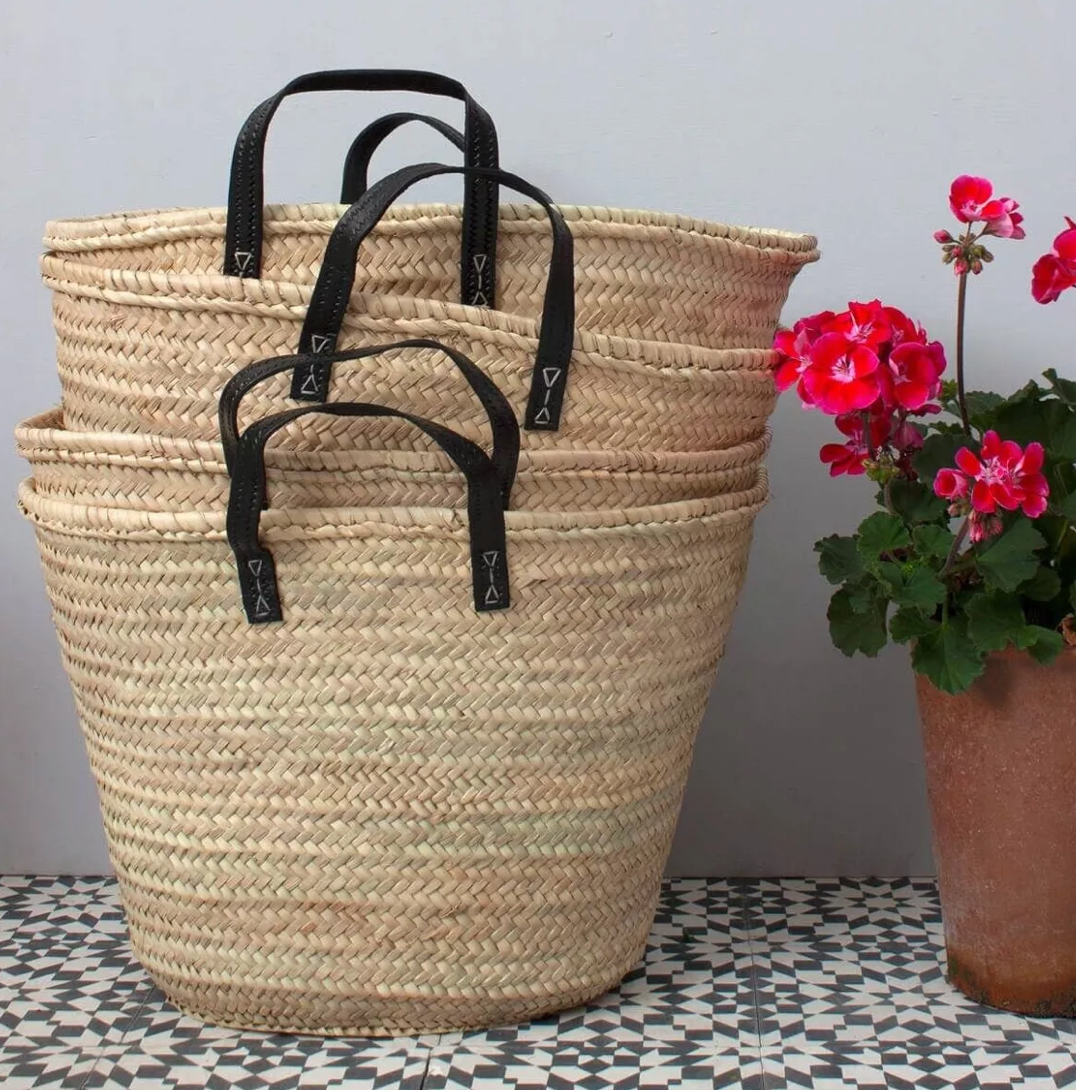 Notre panier Parisienne avec poignées en cuir noir gaufré est un shopper de marché classique, tissé à la main par des artisans au Maroc à partir de feuilles de palmier d'origine locale.